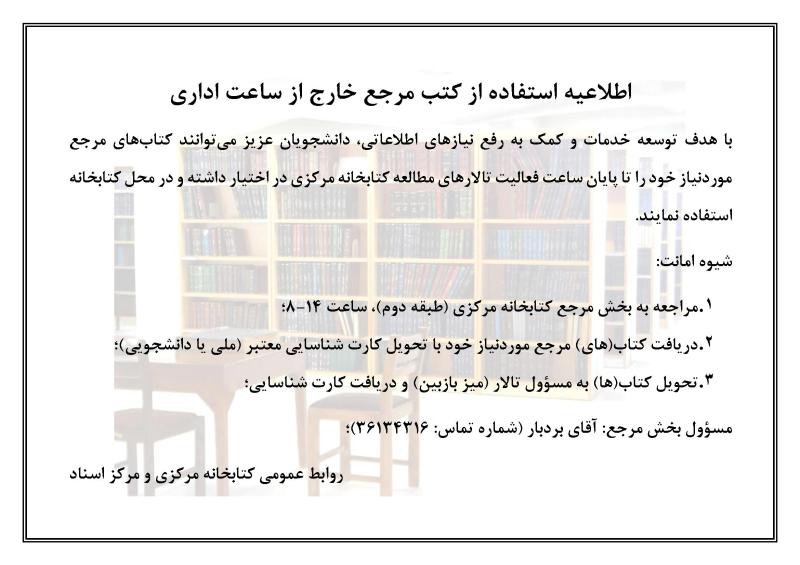 ?? با هدف توسعه خدمات و کمک به رفع نیازهای اطلاعاتی، دانشجویان عزیز می‌توانند کتاب‌های مرجع موردنیاز خود را تا پایان ساعت فعالیت تالارهای مطالعه کتابخانه مرکزی در اختیار داشته و در محل کتابخانه استفاده نمایند.