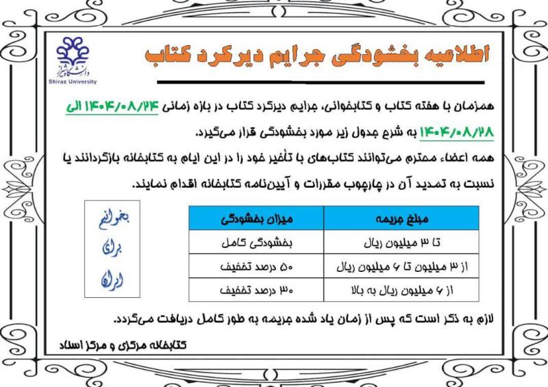 همزمان با هفته کتاب و کتابخوانی، جرایم دیرکرد کتاب در بازه زمانی ۱۴۰۴/۰۸/۲۴ الی ۱۴۰۴/۰۸/۲۸ به شرح زیر مورد بخشودگی قرار می گیرد. همه اعضاء محترم می توانند کتاب های با تأخیر خود را در این ایام به کتابخانه بازگردانند یا نسبت به تمدید آن در چارچوب مقررات و آیین نامه کتابخانه اقدام نمایند.