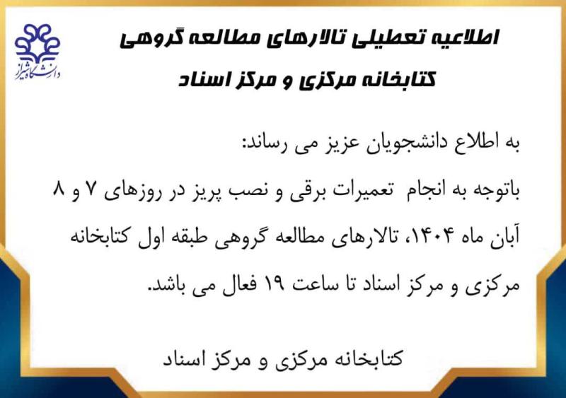 با توجه به انجام تعمیرات برقی و نصب پریز در روزهای 7 و 8 آبان ماه 1404، تالارهای مطالعه گروهی طبقه اول کتابخانه مرکزی و مرکز اسناد تا ساعت 19 فعال می باشد.